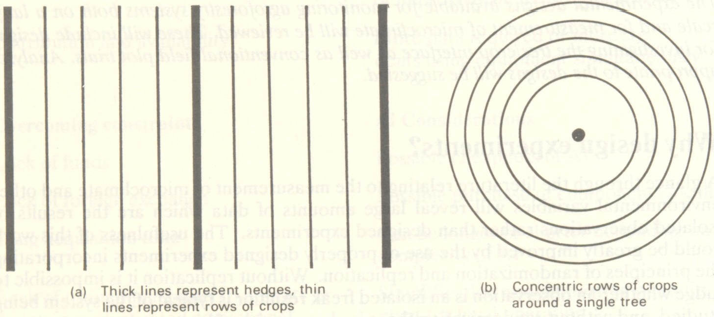 A glance through the literature relating to the measurement of microclimate and other environmental variables will reveal large amounts of data which are the results of isolated observations rather than designed experiments. The usefulness of this work could be greatly improved by the use of properly designed experiments incorporating the principles of randomization and replication. Without replication it is impossible to judge whether an observation is an isolated freak result or is typical of the system being studied, and without randomization there is always a risk of bias.