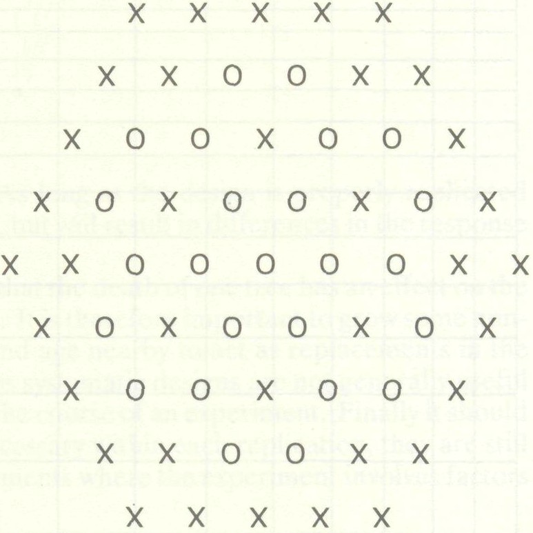 In most experiments plants are arranged in rows but, if the interactions between individual plants are of interest, a hexagonal grid can be useful and such arrangements have been used in competition experiments. These designs are termed beehive designs and further information about them may be found in Veevers and Boffey (1975) and Martin (1973). An example is shown in Figure 7 in which o and x represent two different species. It can be seen that different plants have different numbers of neighbours of the other species, thus allowing the measurement of competitive effects. Hexagonal designs can be easily adapted to the situation where more than two species are involved and provide a greater number of inter-specific interfaces than in a row layout.